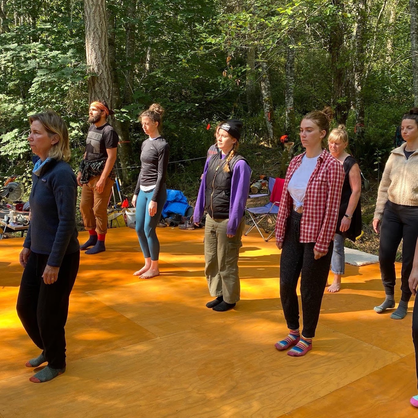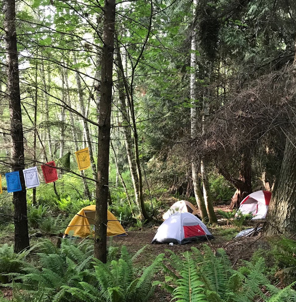 Upon purchasing the San Juan Island property, we vowed to run retreats for at least five years while we studied the land, the passage of the sun, and the weather patterns. For our first week-long retreat, we set up a Costco tent as the meditation hall and built a platform for our first canvas tent that went up in the clearing where we had originally camped. We drove to town each day to do the movements at the Grange, which housed a beautiful grand piano on hardwood floors. We took showers at the Marina during the lunch break.